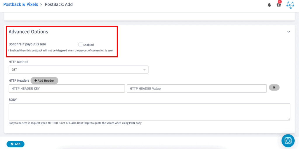 This setting is optional for only a few publishers who want to setup Postback to have the header and different body as payload.
