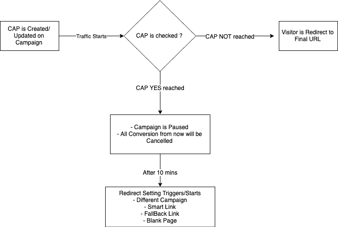 When the CAP on Campaign or Publisher or Geo or Landing Page is reached then the Campaign or specifically that publisher, Geo Or landing page tracking link will be paused by the system & you can see the message on the Campaign Info page.