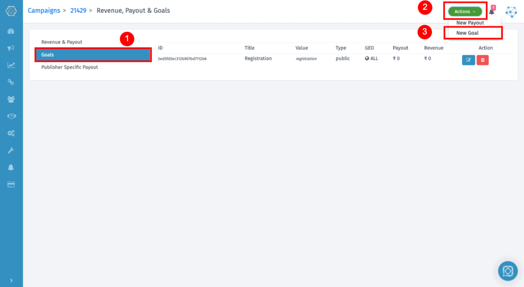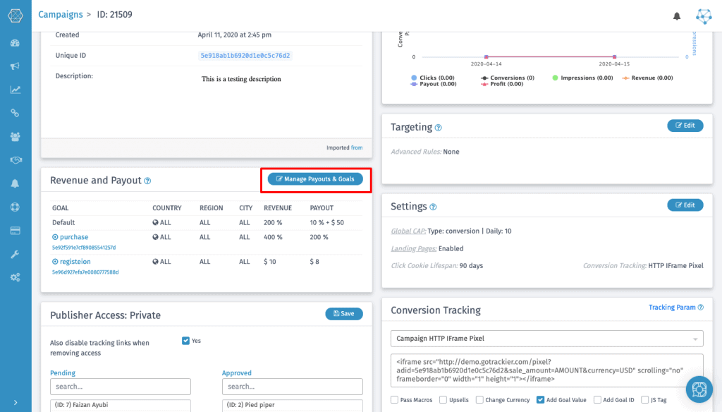 After fetching the campaign through the API, you will find the section of Revenue and Payout on your panel. The Goals can be created via the Manage Payout and Goals section as shown below.