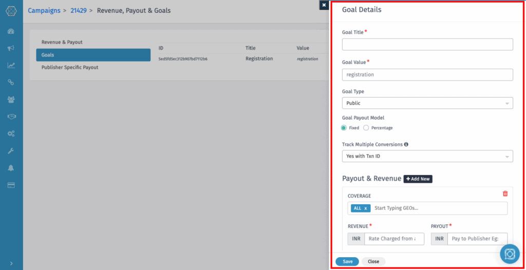 - Goal Payout Model: The payout model for the goal can be decided and selected accordingly. It can be either fixed commission or percentage.