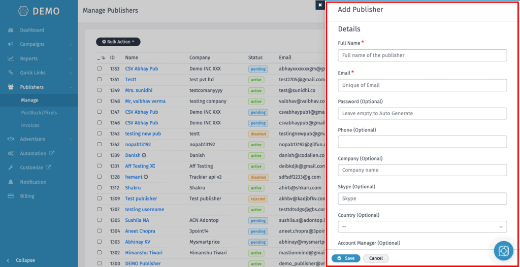 If you have any issue while adding a publisher on your panel, please refer to this article or reach out to us at support@oldtrackierwebsite.trackier.com.