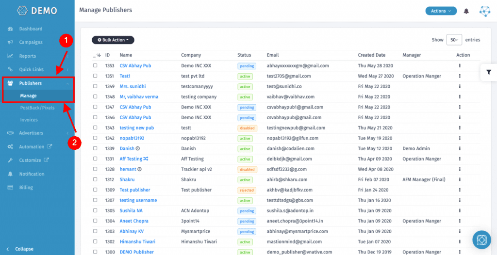 After you are done adding your publishers, you can manage all of them and can change their status from one common page. You can use this section to have a basic overview (like company, status, etc.)of them all at once.