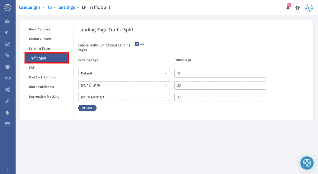 - Set the percentage of traffic you need on the particular landing page.