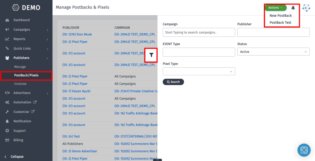 Also we have added a new Filter for postback, now you can search based on pixel type as well in the list.